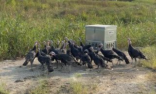 Another option for three month old Rios is to provide us with a feeder. We will make sure they are trained to use it before they leave here. Some people let them forage right away and others put them in a barn or other enclosure so they can acclimate. The feeder shown above is made in Texas (All Seasons Feeders - Turkey Feeder) and works well but others are also available from different manufacturers.